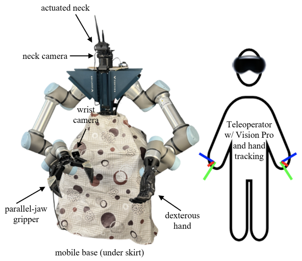 Learning to look around: Enhancing teleoperation and learning with a human-like actuated neckCoRL 2024 Workshop WCBM (Spotlight) We introduce a teleoperation system with a 5-DOF actuated neck that replicates natural human head movements, providing operators with a more intuitive view of the environment. The system improves task performance, reduces cognitive load, and facilitates complex whole-body manipulation across seven challenging teleoperation tasks. We demonstrate how the actuated neck supports better spatial awareness in training autonomous policies through imitation learning, reducing distribution shift compared to static wide-angle cameras. |