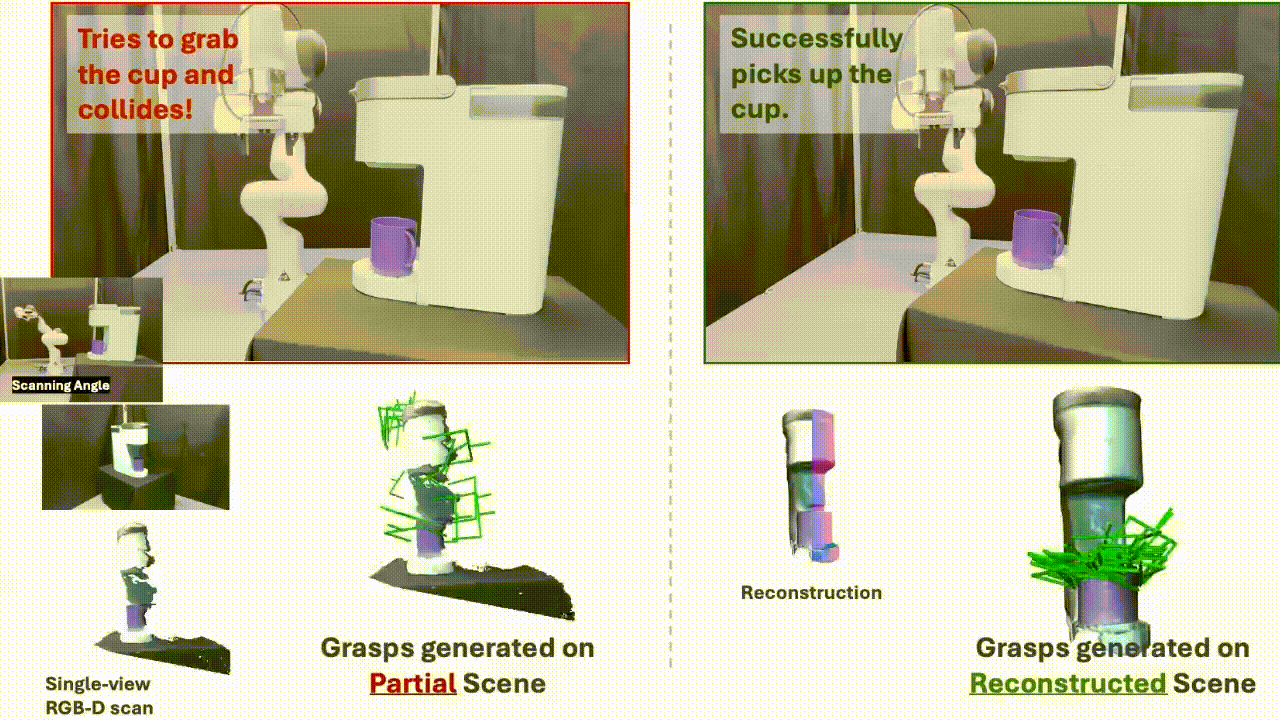 SceneComplete: Open-World 3D Scene Completion in Cluttered Real World Environments for Robot ManipulationPaper / Project Page / Code / Video We propose SceneComplete, a method for open-world 3D scene completion in cluttered real-world environments to improve robot manipulation. Our approach enables robots to reason about occluded and unseen parts of objects and scenes, enhancing their ability to plan and execute manipulation tasks in complex, real-world settings. |